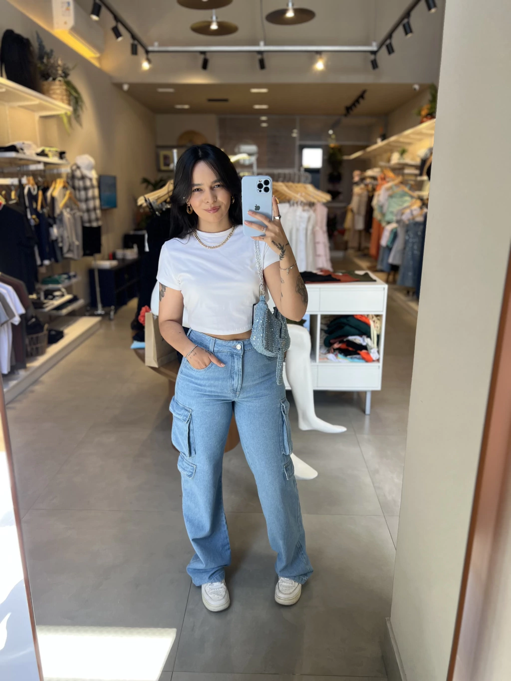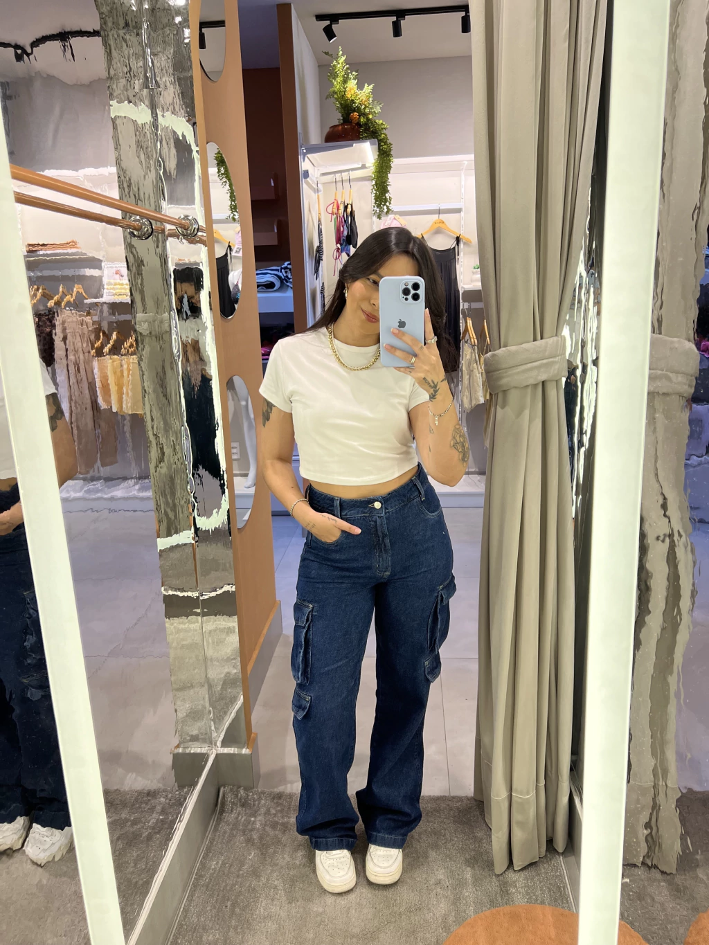Modelagem wide leg confortável e estilosa, jeans azul com caimento soltinho e bolsos cargo laterais que trazem personalidade e praticidade para o dia a dia. Combina com cropped, t-shirt ou até moletom para criar looks urbanos e autênticos. Perfeita para quem gosta de movimento e estilo.