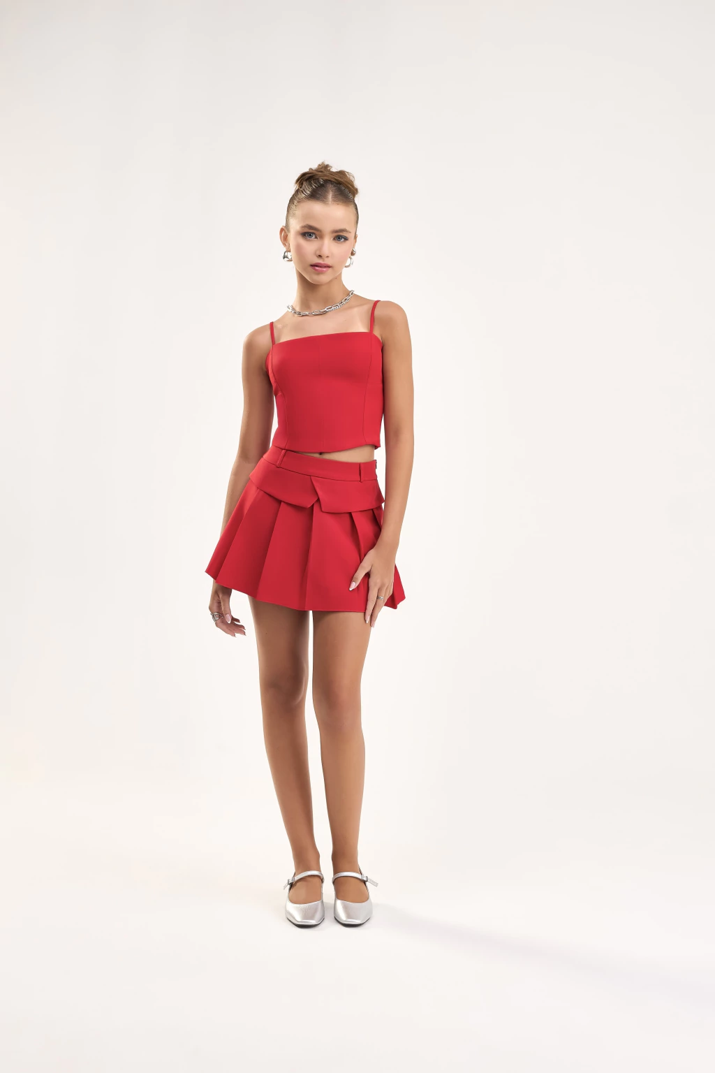 Conjunto em alfaiataria leve com cropped de alcinhas finas e caimento estruturado, acompanhado de saia estilo pregueada com detalhe de pala que traz um charme extra ao visual. Confortável e elegante, é perfeito para ocasiões especiais e looks fashionistas.