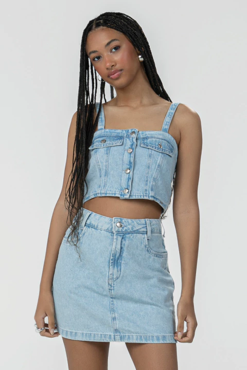 Saia jeans em lavagem clara, com modelagem reta e cós de cintura média. Possui bolsos funcionais e fechamento frontal com botão e zíper. Versátil e super easy de combinar — perfeita para looks casuais, urbanos e fresquinhos.